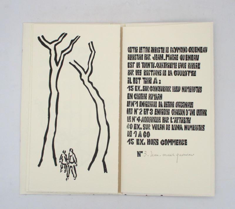 Édition originale posthume d’une lettre de Raymond Queneau, illustrée par son fils Jean-Marie. Un des 60 exemplaires sur vélin de Lana, signé à la justification par Jean-Marie Queneau, celui-ci comporte un envoi autographe signé de Jean-Marie Queneau à l’artiste Jean Cortot. On joint une invitation pour une signature du présent ouvrage à la galerie Virgile.