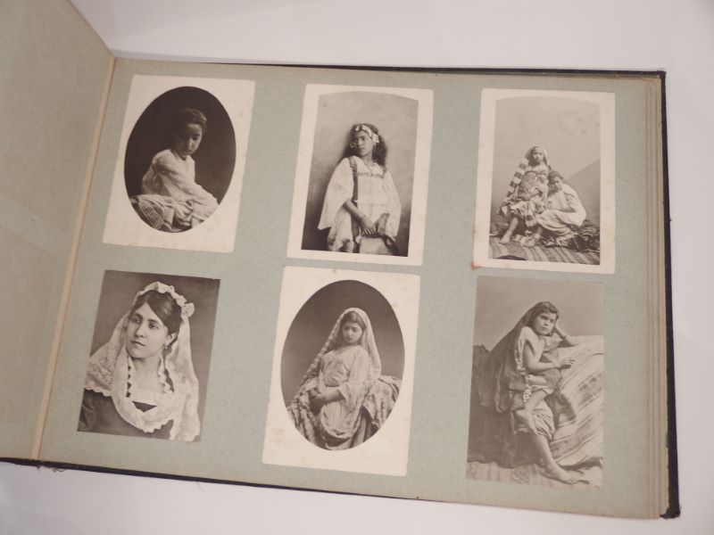 Album de vues d’Alger, Blidah, Clemsen, Terniel-el-Haad, Bou-Saada, Biskra, campements, etc. et de portraits (Ben Galli, femme des Ouled-Naïl’s, Ben-Aouda et son lion, Raïs ancien pirate, une belle série de portraits d’enfants, etc.) dont quelques européens (dont Emile Portier enfant).
