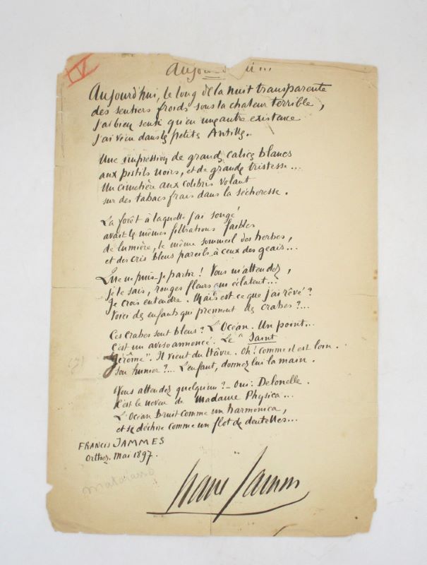 Poème autographe signé de 24 vers divisés en 6 quatrains. Il a paru dans l’Angélus de l’aube en 1897 et est dédié à Tristan Klingsor.