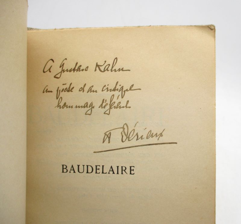 Édition originale en volume de trois essais précédés d’un poème dédicace et ornés d’un portrait de Baudelaire à 40 ans. Cet exemplaire comporte un envoi autographe signé de l’auteur à Gustave Kahn, poète et critique d’art.