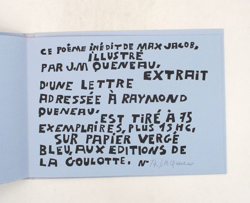 Édition originale posthume de ce poème illustré par Jean-Marie Queneau et comprenant un extrait d’une lettre adressée par Max Jacob à Raymond Queneau. Un des 75 exemplaires tirés sur papier vergé bleu, seul tirage annoncé avec quelques hors commerce, celui-ci comporte un envoi autographe signé de Jean-Marie Queneau à l’artiste Jean Cortot.
