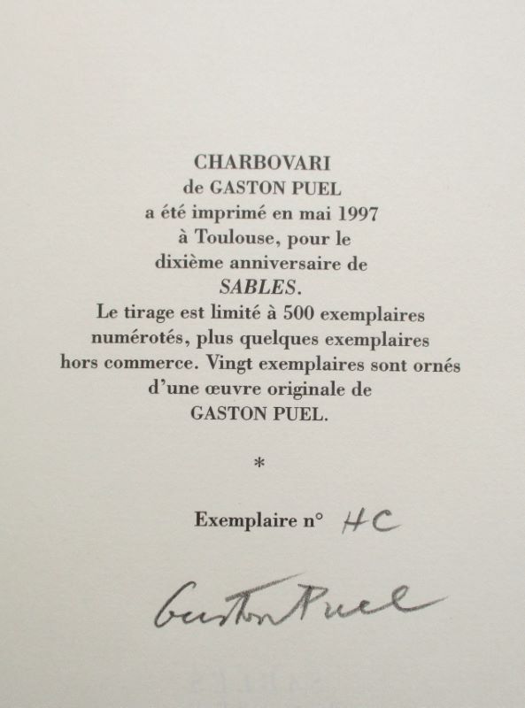 Édition illustrée d’une oeuvre originale signée de Gaston Puel. Un des quelques exemplaires hors commerce. Cet exemplaire comporte un envoi autographe signé de l’auteur à l’éditeur et l’auteur Thierry Bouchard, daté de septembre 1997.