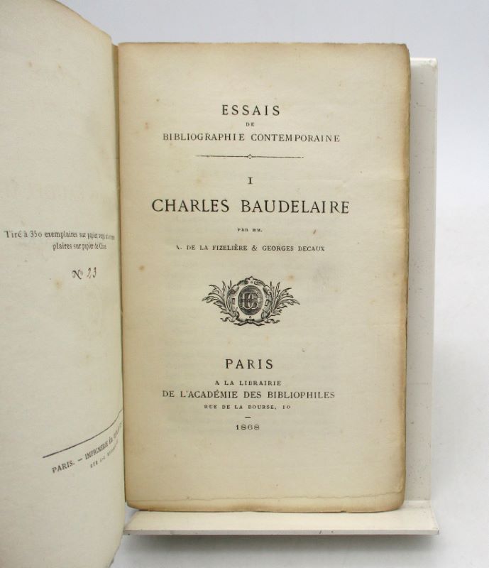 Édition originale de la première bibliographie de Baudelaire. Un des 350 exemplaires sur vergé, second papier après 10 Chine. Ex-libris gravé de R. Cortot.