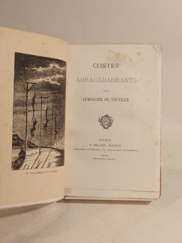 Edition originale, bel exemplaire dans son brochage d’origine. Jolie couverture illustrée et curieux frontsipice « trois potences et six pendus ».