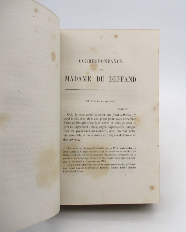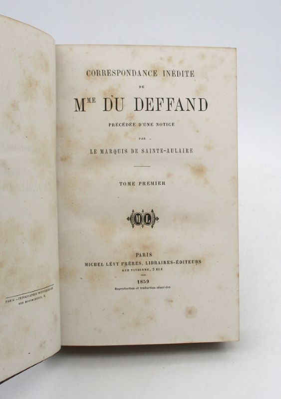 Nouvelle édition des lettres de la marquise de Duffand. Elle est précédée d’une notice du marquis de Sainte-Aulaire. Ex-libris héraldique des Harcourt, de la bibliothèque du château de St Eusoge, propriété de la famille.