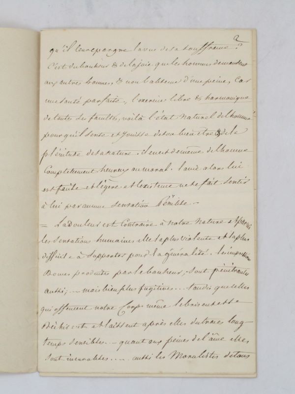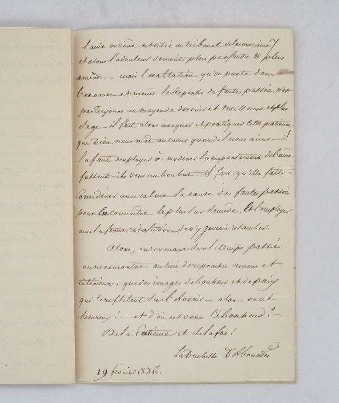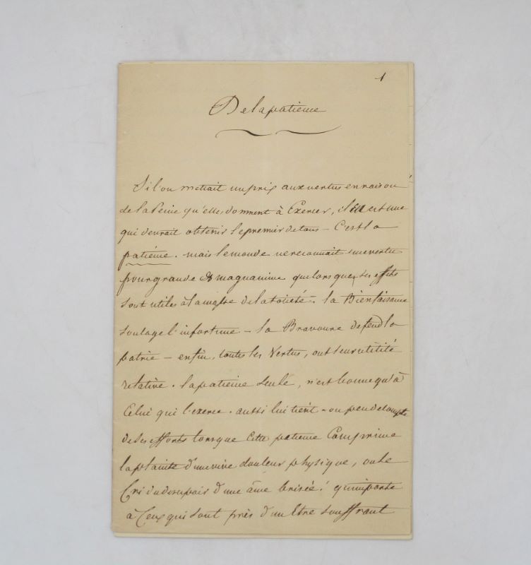 Manuscrit autographes signé cet éloge de la vertu qu’est la patience qui aide à traverser toutes les épreuves voire mener au bonheur. Une mention manuscrite l’accompagnant évoque sa parution dans les Mémoires de Mme la duchesse d’Abrantès (Paris, Ladvocat, 1835, volume VI) mais il ne nous a pas été possible de retrouver la version imprimée. Si elle est bien présente dans ces Mémoires, ce serait donc une copie ultérieure à la parution de l’ouvrage.