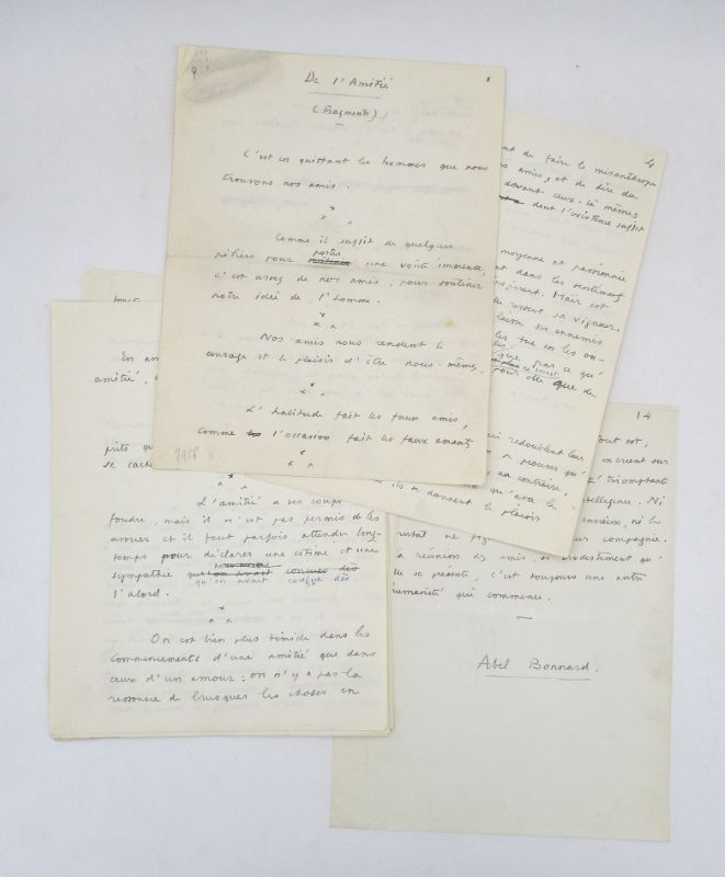 Manuscrit autographe signé dont la première partie (7 pp.) est un succession d’aphorismes relatifs à l’amitié et la seconde s’intéresse aux divers types d’amitiés et à leur essence. Une partie semble avoir été publiée dans l’ouvrage L’Amitié de Bonnard, paru chez Hachette en 1928.