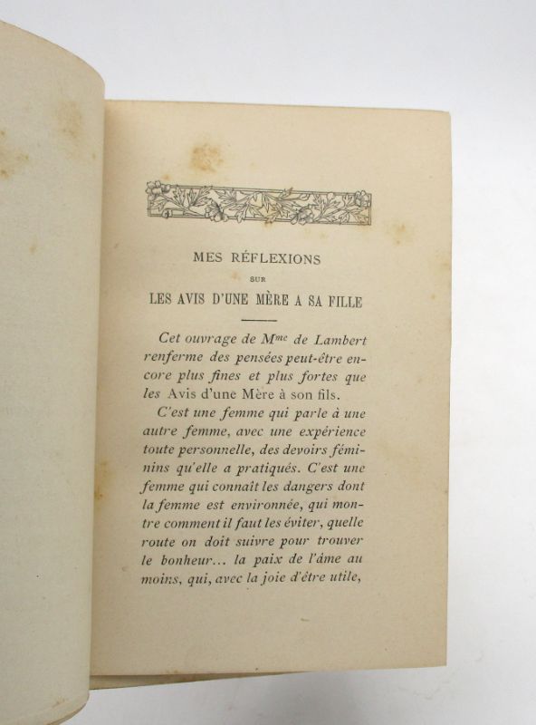 Sixième édition de ce manuel d’éducation des jeunes filles, comportant Mes réflexions sur les Avis de la marquise de Lambert à sa fille. Complet du catalogue de l’éditeur.