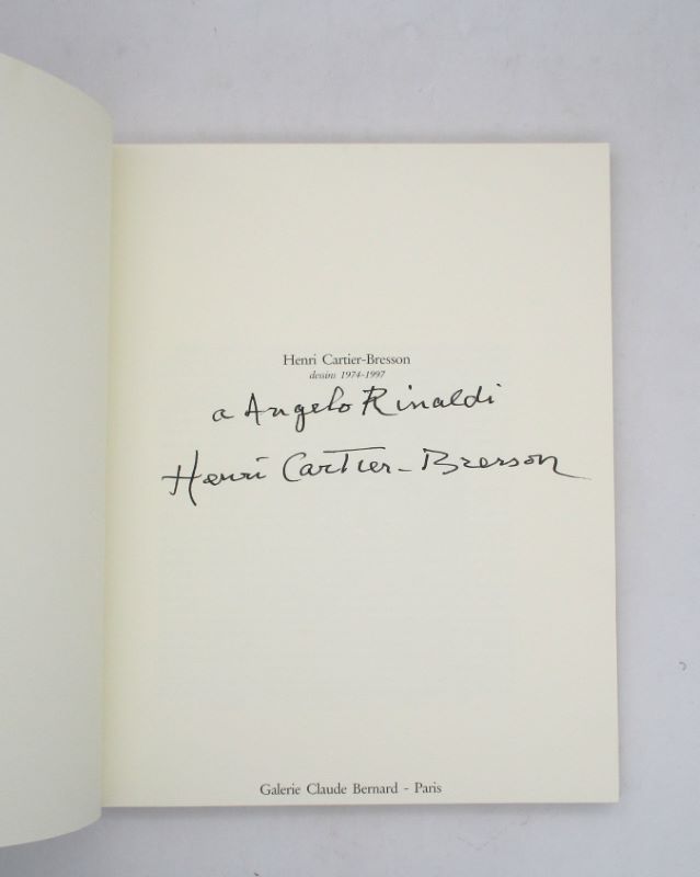 Édition originale de ce catalogue d’expositions des oeuvres de Cartier-Bresson à la galerie Claude Bernard. Cet exemplaire comporte un envoi autographe signé d’Henri Cartier-Bresson à Angelo Rinaldi, un écrivain et journaliste français. Nombreuses illustrations en noir.
