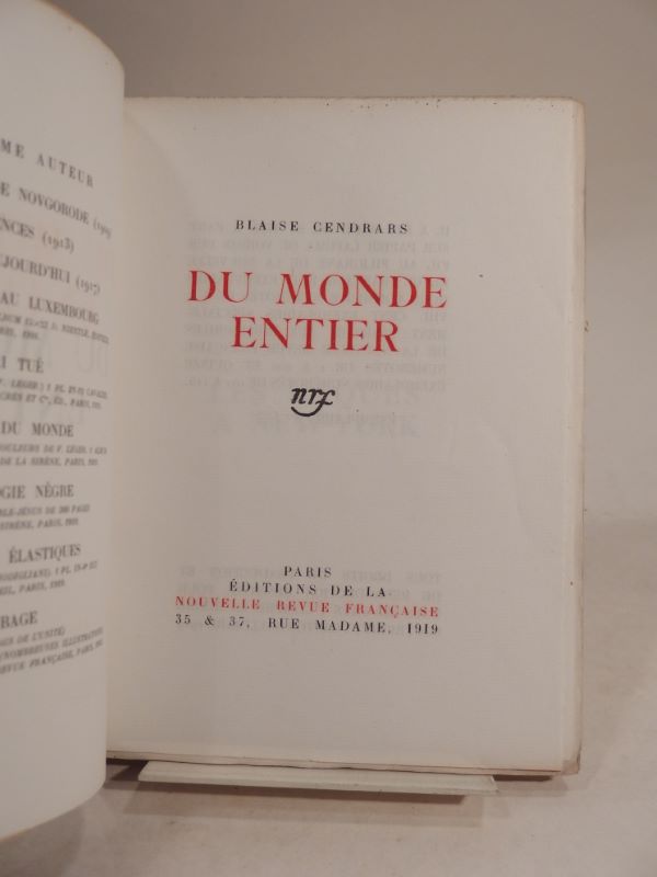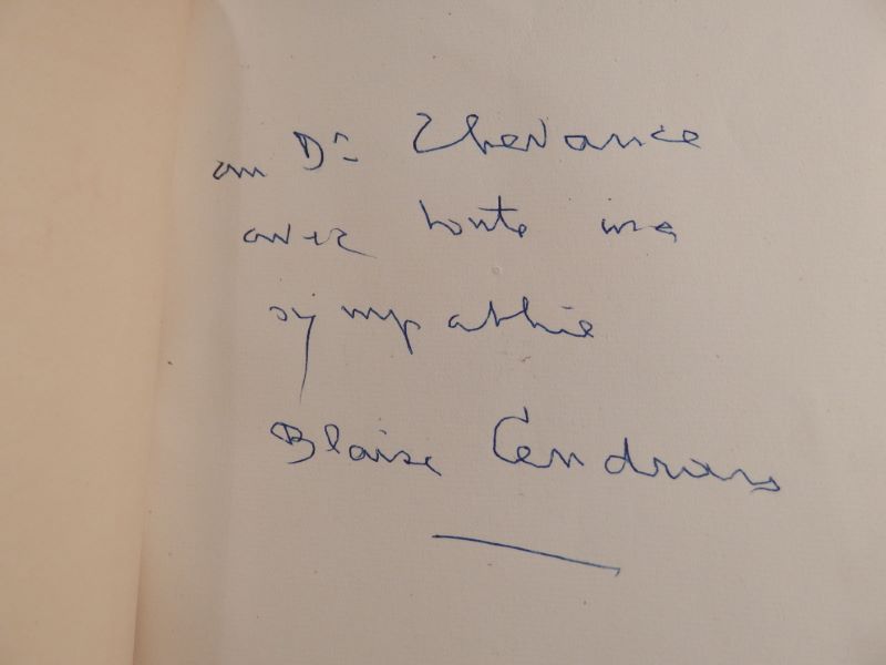 Edition originale, UN DES 123 exemplaires de tête numérotés, réimposés sur Lafuma de Voiron. ENVOI autographe signé de Cendrars au Dr Thévance.