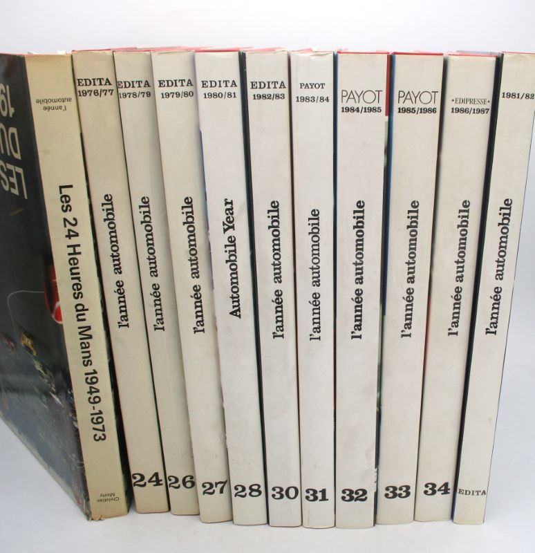 Cet ensemble comprend les numéros 24 (1976-1977), 26 à 34 (1978-1988). Ils sont tous abondamment illustrée, parfois en couleurs. On joint : Christian Moity. Les 24 Heures du Mans 1949-1973. Lausanne, Edita, 1974. In-folio, 218 pp. cartonnage éditeur rouge, jaquette éditeur illustrée. Nombreuses illustrations, certaines en couleurs (petites déchirures à la jaquette).