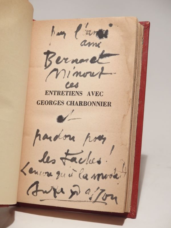 Edition originale sur papier courant. Bel ENVOI autographe signé de Masson à Minoret : « Pour l’ami Bernard Minoret ces ‘Entretiens avec Georges Charbonnier’ et pardon pour les taches ! (encore qu’à la mode ! ) André Masson ».