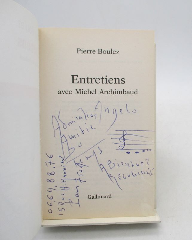 Édition originale de cette entrevue du célèbre musicien moderne. Cet exemplaire comporte un envoi autographe signé du compositeur au journaliste Angelo Rinaldi, accompagné de quelques notes de musique.