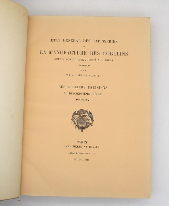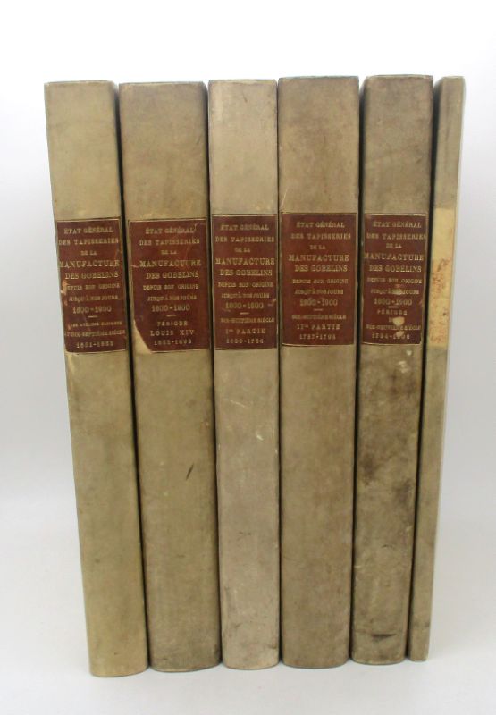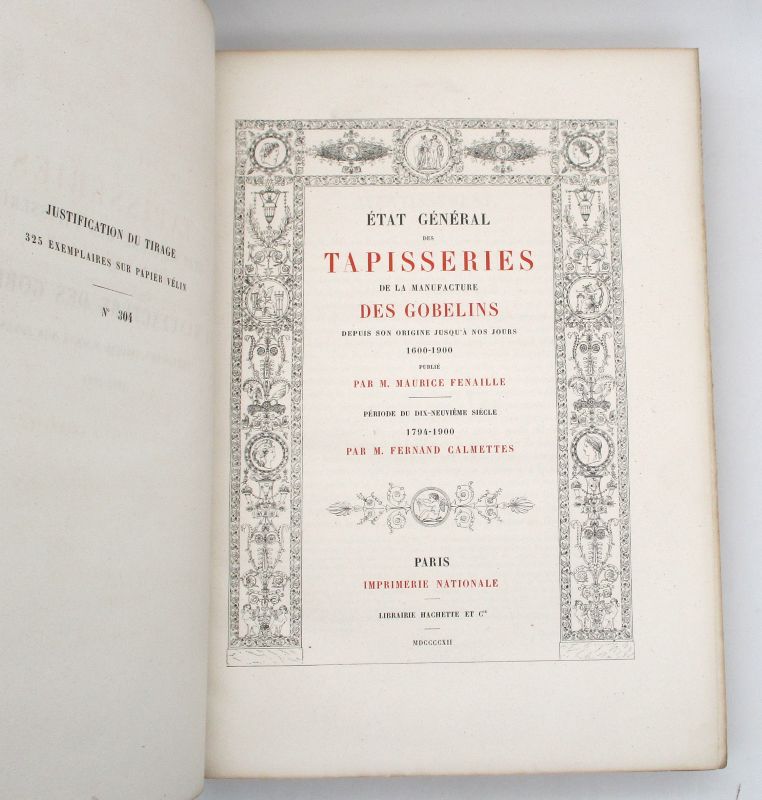 Imposante monographie consacrée aux productions de la Manufacture des Gobelins. Elle est illustrée de 287 planches héliogravées et de nombreuses reproductions dans le texte. Un des 325 exemplaires sur papier vélin, seul tirage annoncé. Le sixième et dernier volume comprend les tables.