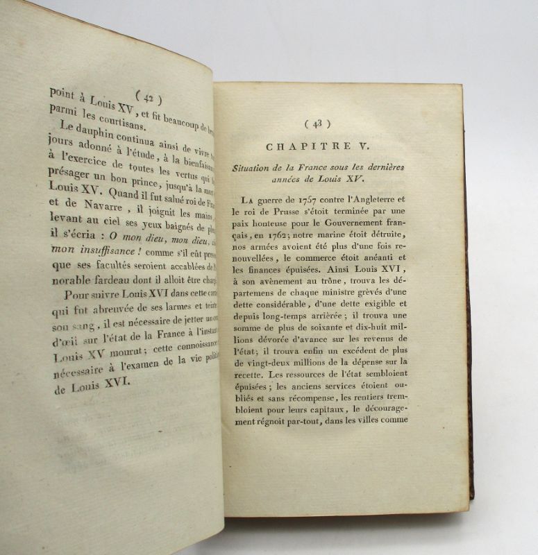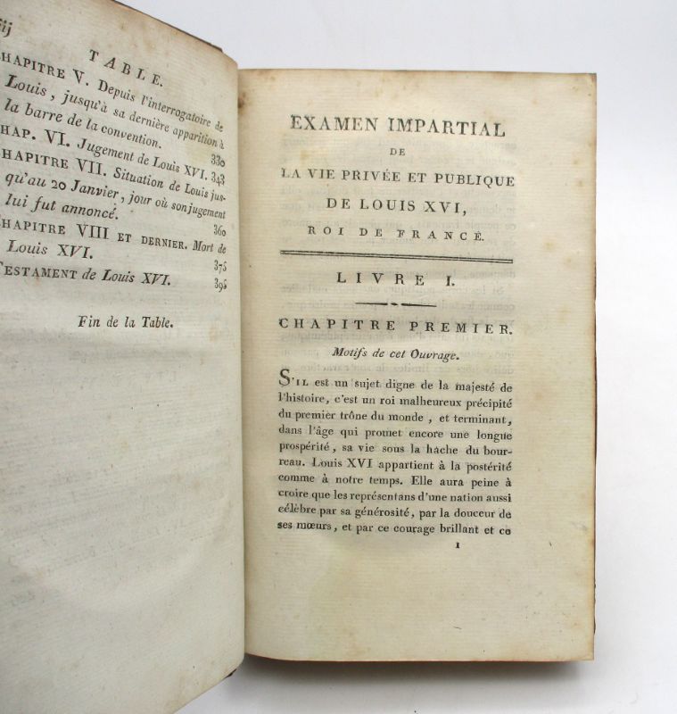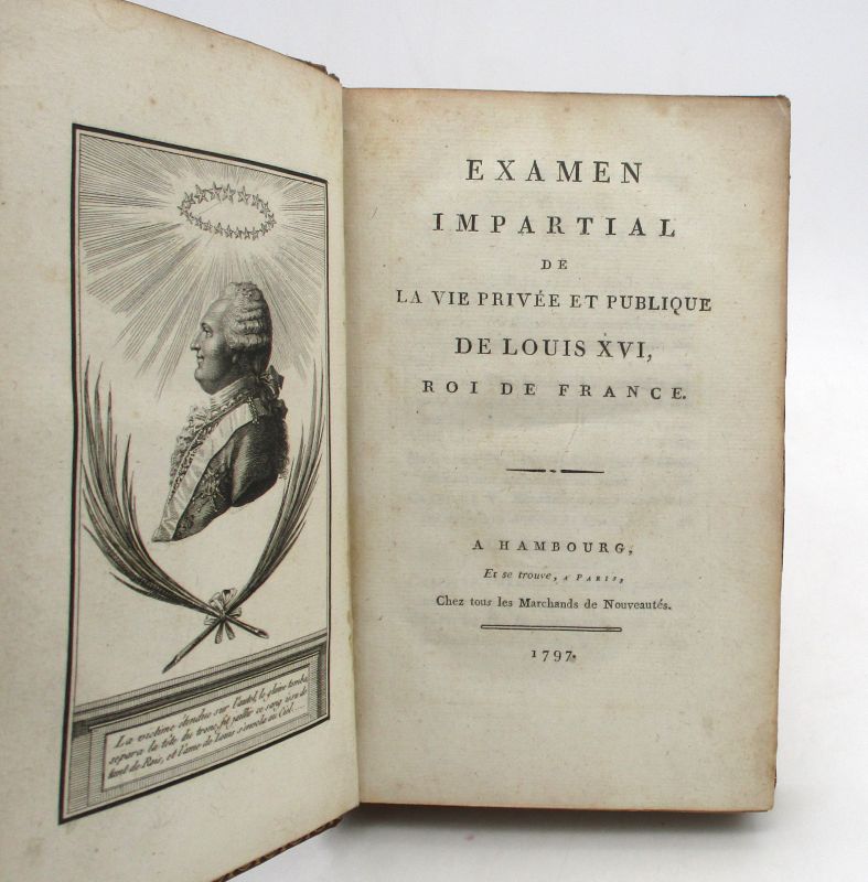 Édition originale ornée d’un portrait de Louis XVI au frontispice, d’une scène entre lui et son fils lors de sa détention et de la scène de ses adieux à sa famille avant son exécution. Il contient le Testament de Louis XVI, relié in fine. Barbier, II, 360e. Jolie reliure de maroquin aux armes des Parenty.