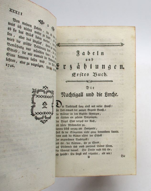 Nouvelle éditions des fables et contes du moralisateur allemand Christian Fürchtegott Gellert. Ex-libris héraldique du château des Perrays.