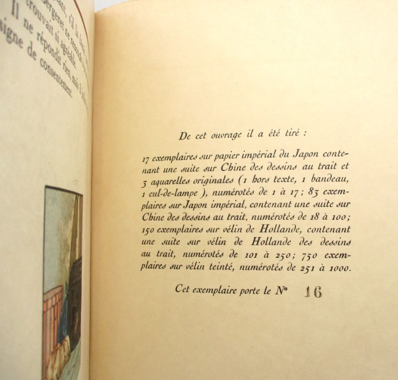 Belle édition illustrée des compositions en couleurs de Beaune. Un des 17 exemplaires sur papier impérial du Japon comportant 3 aquarelles originales de Beaune mais sans la suite sur Chine. Exemplaire non coupé.