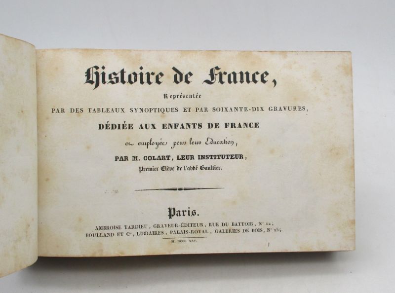 Édition originale de cette histoire de France comprenant 16 pages d’introduction, 1 tableau dépliant, 70 gravures en noir d’Ambroise Tardieu, 106 feuillets d’explication et 2 planches d’étiquettes.