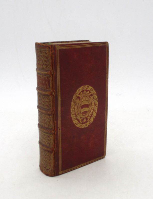 Amsterdam, Daniel Elzevier, 1664. In-12, [12]-566-[20] pp., maroquin vieux rouge aux armes dorées, triple filet doré en encadrement sur les plats, dos à nerfs à la grotesque, bordure intérieure ornée de dentelle dorée, garde et doublure de papier blanc à motifs dorés, tranches dorées.