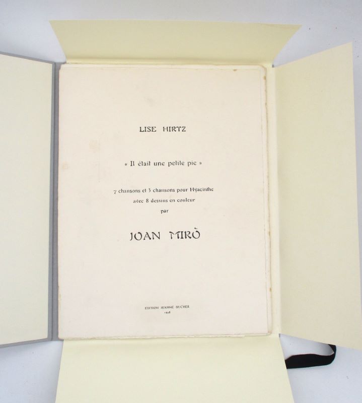 Édition originale du premier livre de Lise Hirtz (Deharme) et du premier livre illustré par Miró comprenant huit compositions en couleurs au pochoir. Un des 280 exemplaires sur Arches.