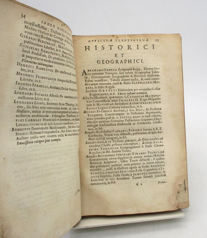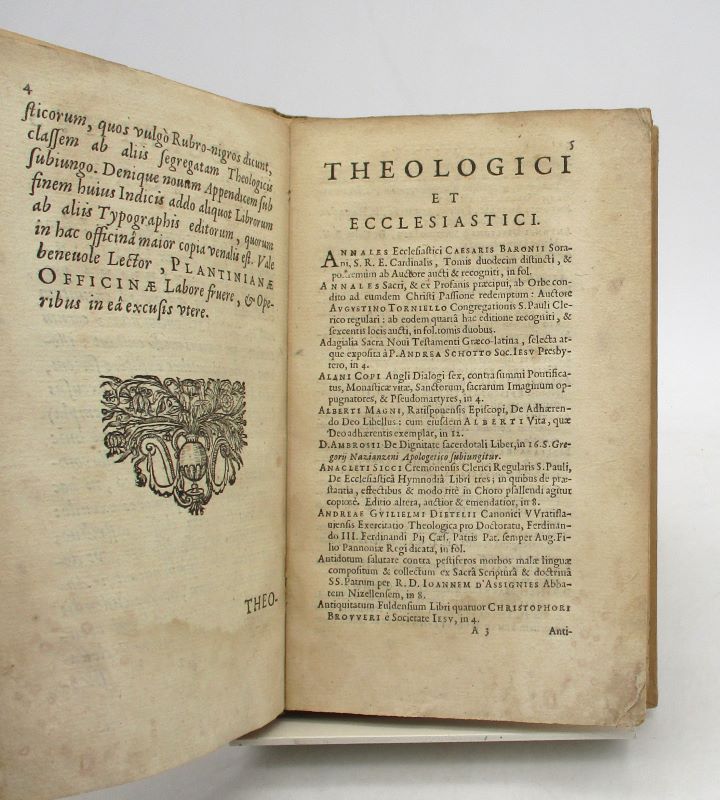 Édition originale du catalogue des livres édités par l’Imprimerie plantinienne, l’avant-dernier, comportant environ 700 titres sans prix. Il est orné d’une marque de l’imprimeur au titre. La partie consacrée aux ouvrages germaniques et flamands est imprimée en caractères gothiques. Plusieurs feuillets séparant les diverses catégories ne comportent que le titre et la pagination en tête, le tout sans manque. Ruelens, 40; Bigmore & Wyman p. 209. Ex-libris gravé d’Alfred Cortot, plusieurs C.A. au cours de l’ouvrage, un tampon illisible au titre.