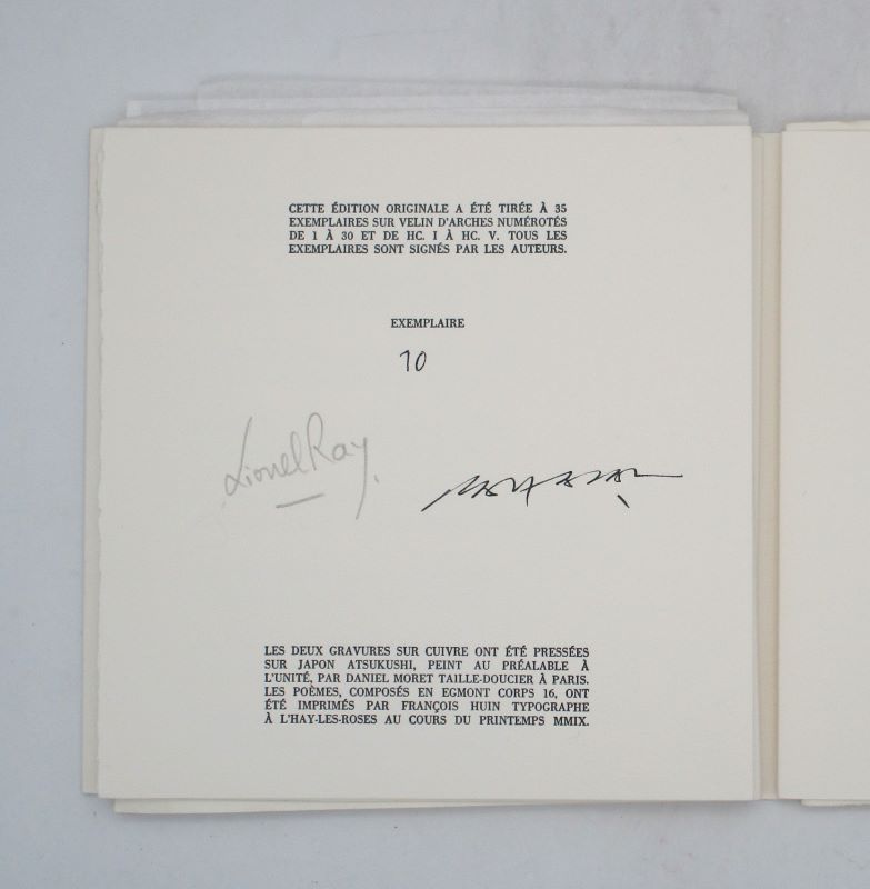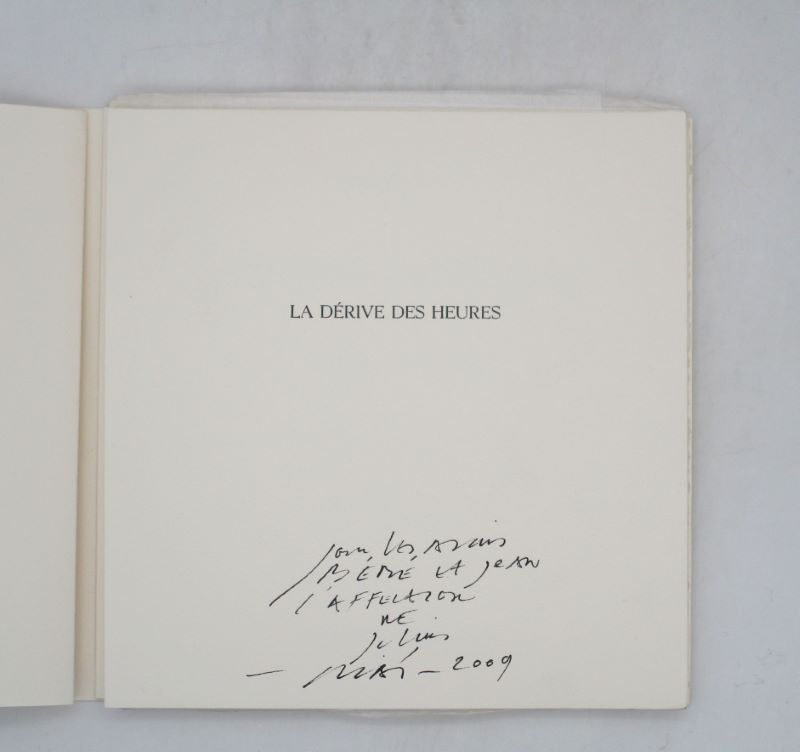Édition originale illustrée de 2 gravures sur cuivre tirées sur Japon Atsukushi, en relief et rehaussées à l’aquarelle et au crayon arlequin par Julius Batlazar. Un des 35 exemplaires sur vélin d’Arches, unique tirage avec 5 hors commerce, signé par l’auteur et l’artiste à la justification. Celui-ci comporte un envoi autographe signé de l’artiste à Jean Cortot, daté de 2009.