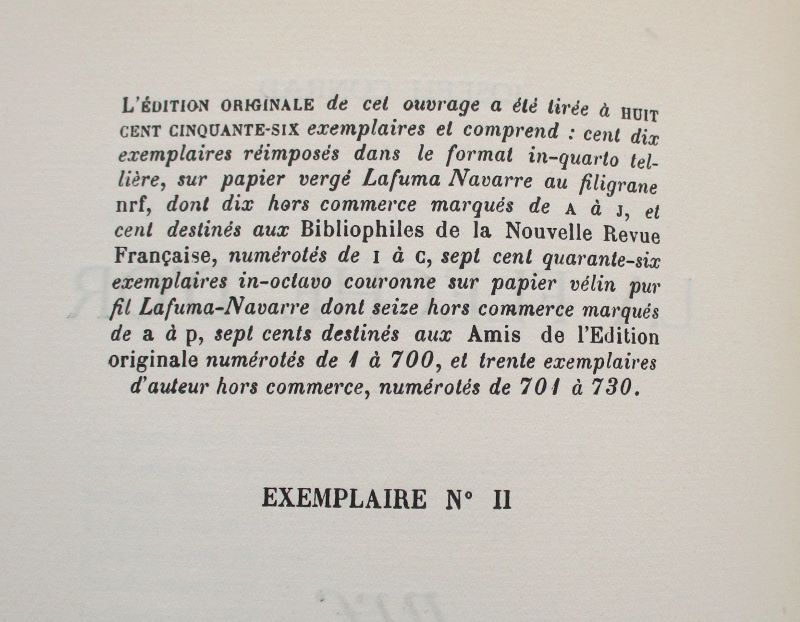 Édition originale française, UN DES 110 RÉIMPOSÉS SUR VERGÉ Lafuma-Navarre, premier papier (ex. n° II). * Dictionnaire des uvres, III, 125.