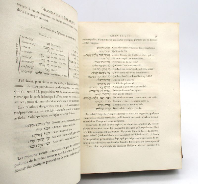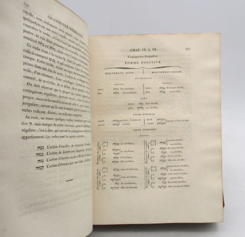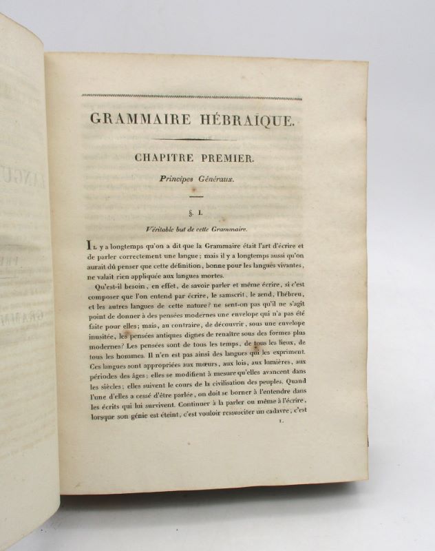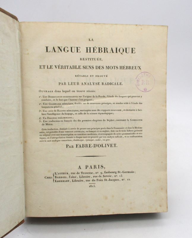 Édition originale rare de cet ouvrage mêlant l’histoire de la langue, sa grammaire, un dictionnaire et une traduction partielle du Sepher. Bien qu’il ne soit pas une référence en la matière, ce livre a passionné les occultistes et a connu plusieurs rééditions. Complet de la liste des souscripteurs et de l’errata. Tampon ex-libris « Bibliothèque R.R. ». Dorbon, p. 164, 1581 : « Très rare édition originale de cet ouvrage classique, indispensable à ceux qui étudient scientifiquement l’Occulte. »