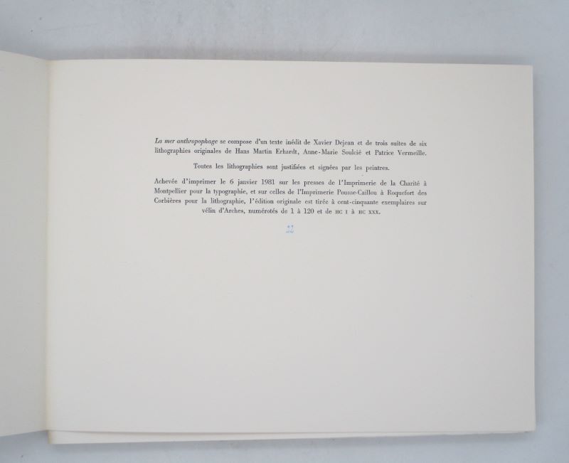 Édition originale illustrée de trois suites de lithographies originales, toutes signées et justifiées par les artistes Vermeille, Erhardt et Soulcié. Un 120 exemplaires sur Arches, seul grand papier.