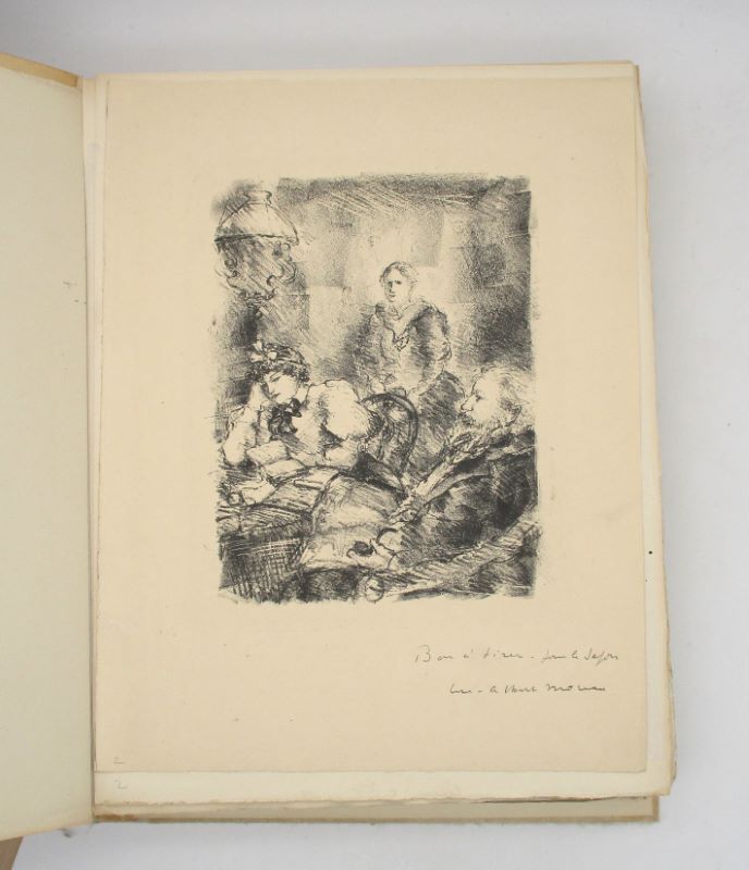 Édition illustrée des lithographies de Moreau. Un des 60 sur vélin pur chiffon des manufactures de Vidalon, celui-ci comporte un envoi autographe signé de l’auteur et de l’artiste à Renée Chaine. Cet exemplaire est enrichi d’un calque, d’un bon à tirer signé par l’artiste en deux états (un sur vélin et un sur Japon), une gravure signée et un 2e état de la vignette de titre tiré sur Japon.