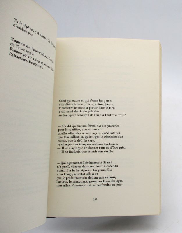 Édition originale de ce recueil. Un des 1650 exemplaires tirés sur bouffant alfa Calypso des papeteries Libert. Cet exemplaire comporte un envoi autographe signé de l’auteur à l’auteur et éditeur Thierry Bouchard.