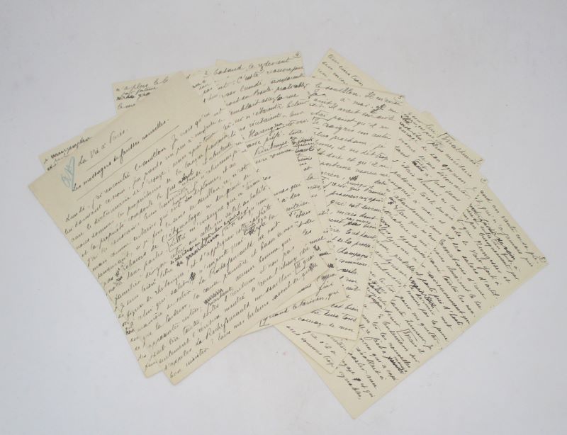 Manuscrit autographe signé de ce chapitre relatant une anecdote dans le Paris de la Première Guerre mondiale. Il comporte de nombreuses corrections et ajouts autographes. La trilogie de La Vie à Paris a paru en trois volumes entre 1917 et 1919.