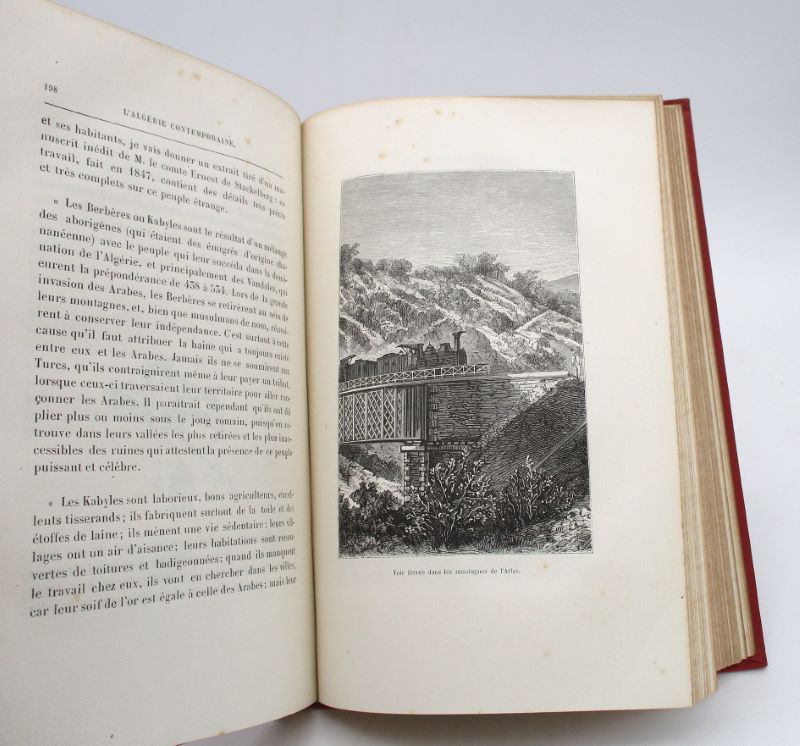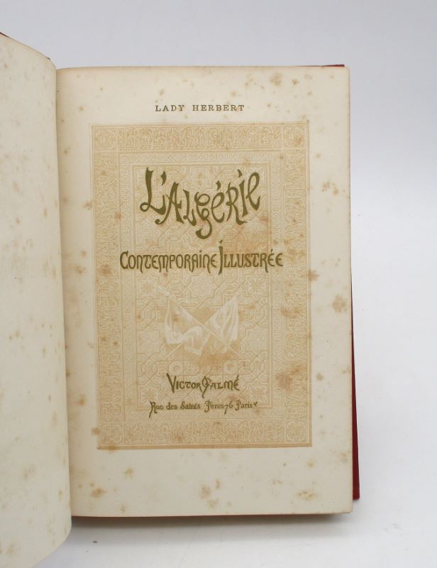 Cartonnage éditeur en très bel état. Oran et Tlemcen, Milianah, Teniet-el-had et Blidah, Alger, Cherchell et Tizi-Ouzou, Constantine, Batna, Lambessa, le gouvernement français en Algérie, Tunis et Carthage. Couverture et titre par Yan d’Argent, 4 aquarelles en couleur par Adrien-Marie. Très nombreuses gravures dans et hors texte par Sargent, Chapon, Thimas, Bervellier, Bure, etc.