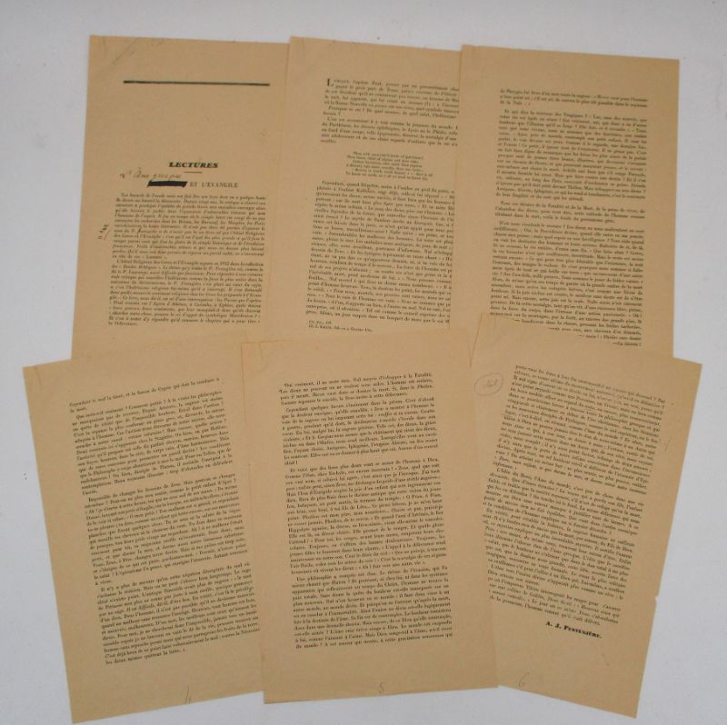 Épreuves comportant deux corrections autographes. Spécialiste de la pensée grecque, Festugière, un dominicain, publie LIdéal religieux des Grecs et lÉvangile, en 1932.