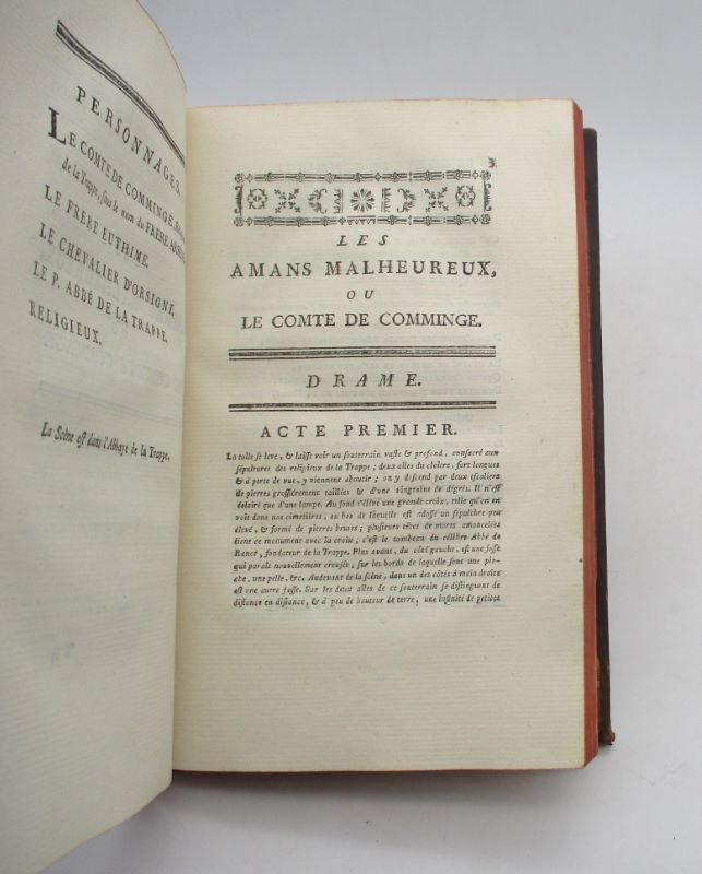 Troisième édition de cette pièce de théâtre comprenant un long discours préliminaire et les Mémoires du comte de Comminge, père de l’auteur. Elle est illustrée de deux gravures en noir par Saint-Aubin d’après Restaut fils pour la première et par Massard d’après C.P. Marillier pour la seconde.