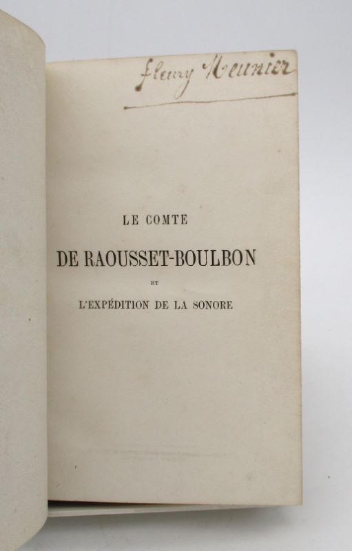 Édition originale mêlant passages de journal, correspondances et biographie de la vie de Raousset-Boulbon. Gaston de Raousset-Boulbon était un aventurier français parti chercher de l’or en Amérique, d’abord en Californie puis au Mexique où il fonde la république de Sonora, ce qui lui vaudra d’être taxé de rebelle par le dictateur Santa-Anna et de finir fusillé en 1854. Ex-libris manuscrit Fleury Meunier au faux-titre.