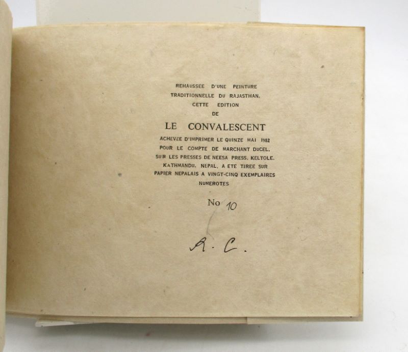 Édition illustrée d’une peinture en frontispice. Un des 25 exemplaires tirés sur papier népalais, seul tirage annoncé, signé des initiales de l’auteur à la justification.