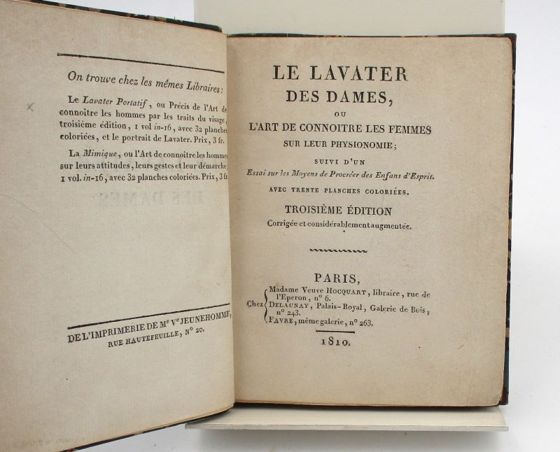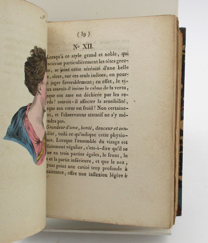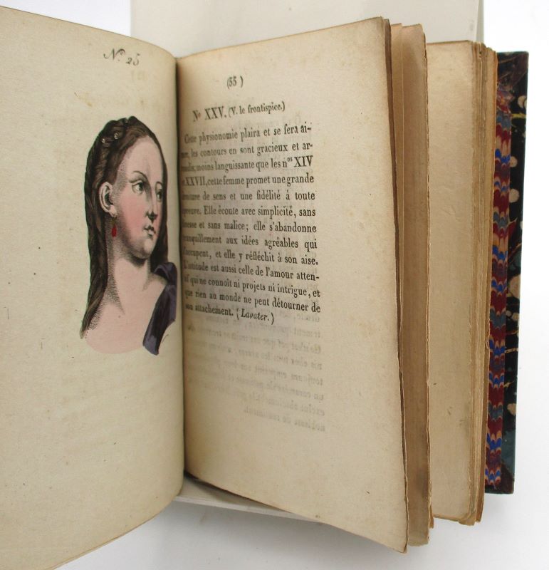 Troisième édition, corrigée et considérablement augmentée. Elle est illustrée de 30 planches (dont 28 sont en couleurs), hors-texte. Ces portraits de femmes se trouvent en regard la description de leur caractère supposé en fonction de leur physionomie. Bien que les théories physiognomistes aient depuis été invalidées, ces curieux portraits attestent de leur importance au XIXe siècle par le nombre de rééditions dont ils feront l’objet.