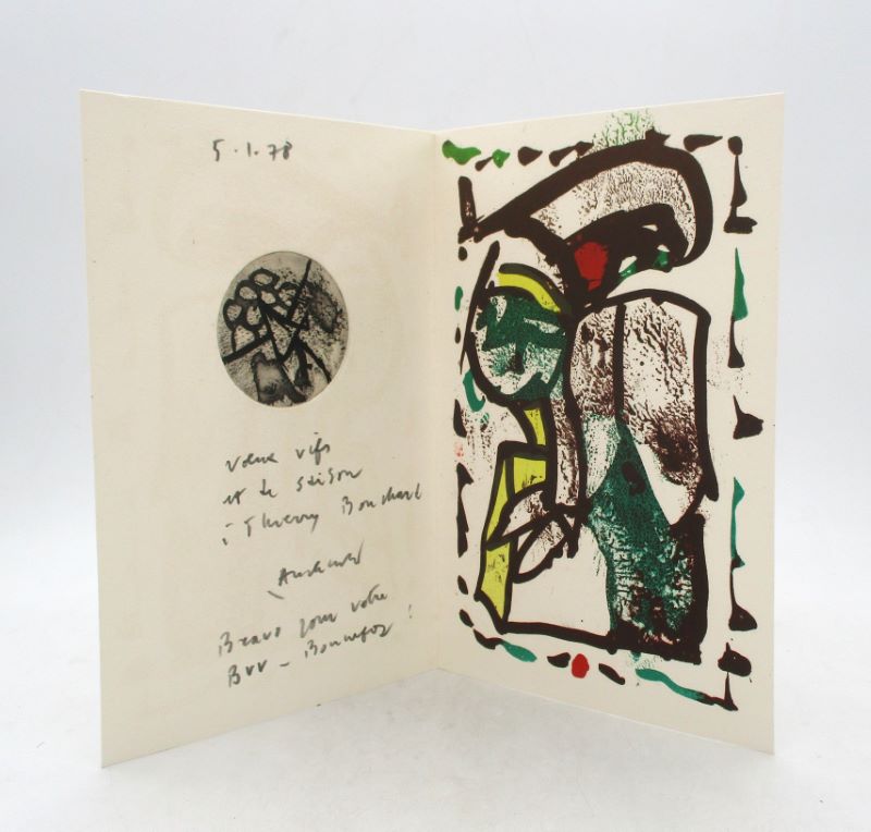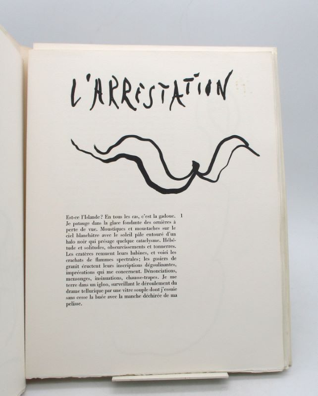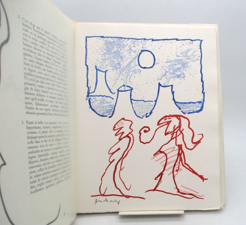 Édition originale illustrée de 5 eaux-fortes en couleurs signées par Alechinsky et de lithographies en noir dans le texte. Un des 120 exemplaires sur Arches, signé et numéroté en fin du texte par l’artiste et l’auteur (sans justification). On joint le carton annonçant la présentation de l’ouvrage à La Hune, le prospectus annonçant l’ouvrage et son tirage, une carte de voeux autographes signée et illustrée par Alechinsky.