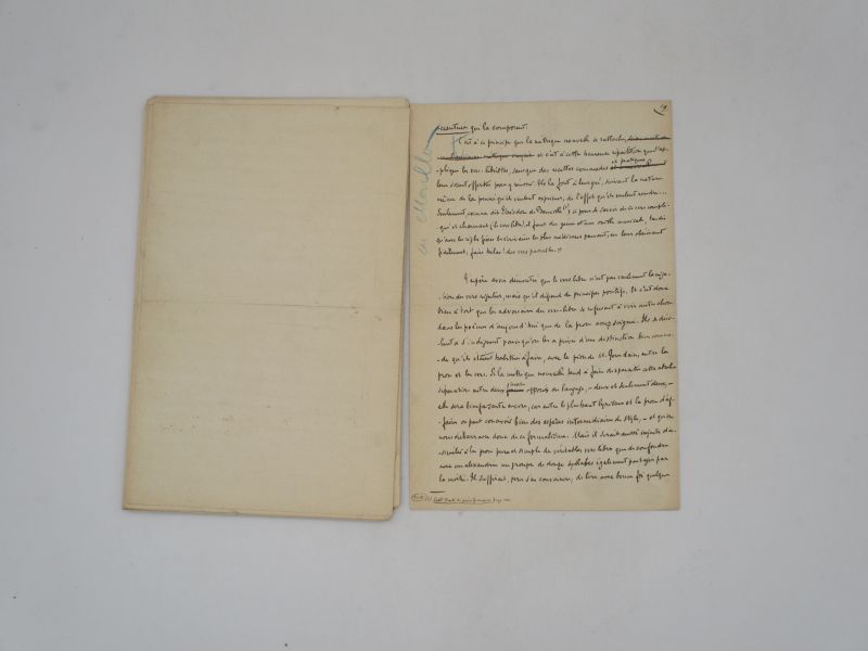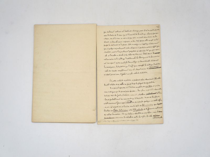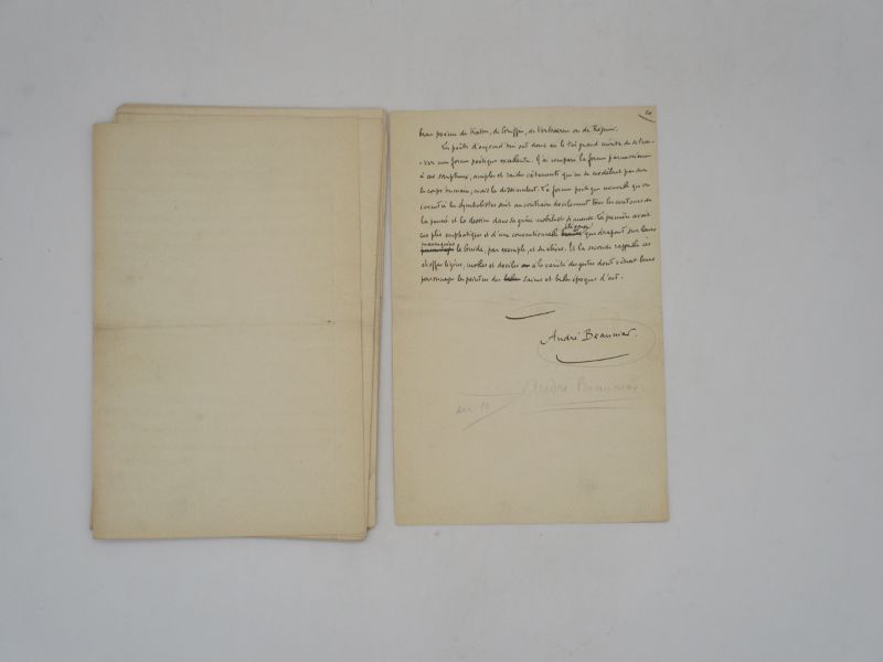 Manuscrit autographe signé complet de cette longue étude consacrée à la poésie symboliste. Il comprend de nombreuses corrections et les annotations du typographe. La première partie de l’essai a été publié dans le Mercure de France de février 1901 sous le titre « Les Parnassiens et les Symbolistes », la seconde partie « Le Vers libre » a paru dans le même revue le mois suivant. Enfin les deux parties sont reprise dans l’introduction de Poésie nouvelle de Beaunier, publié par le Mercure de France, en 1902 avec quelques modifications du texte.