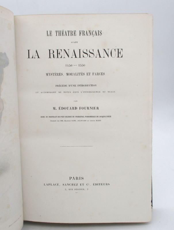 Édition illustrée des compositions en couleurs de Maurice Sand, le fils de George Sand, Adrien Marie et H. Allouard. Cette anthologie regroupe des pièces de théâtre d’auteurs tels Pierre Gringore, Clément Marot ou encore Marguerite de Valois. Elle comporte également une introduction et des notes d’Édouard Fournier.