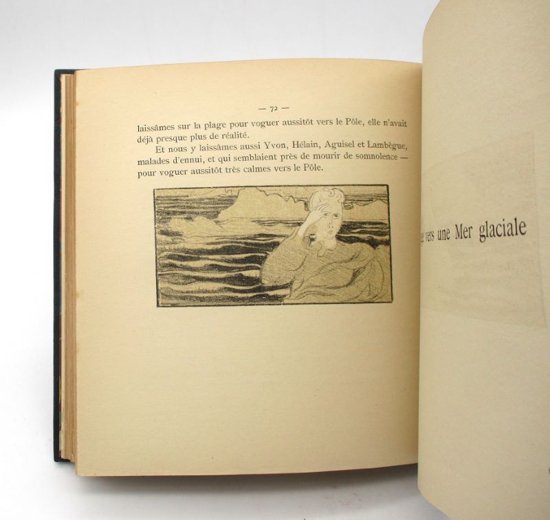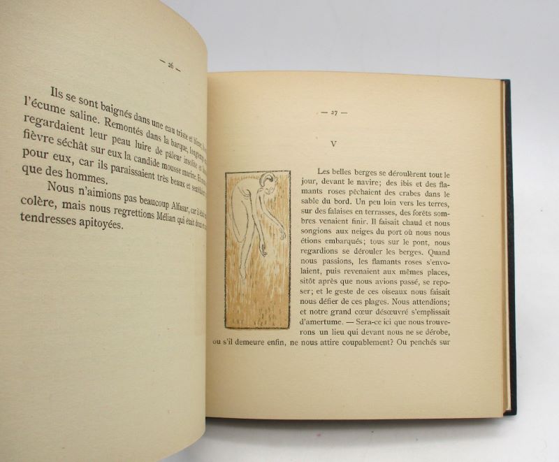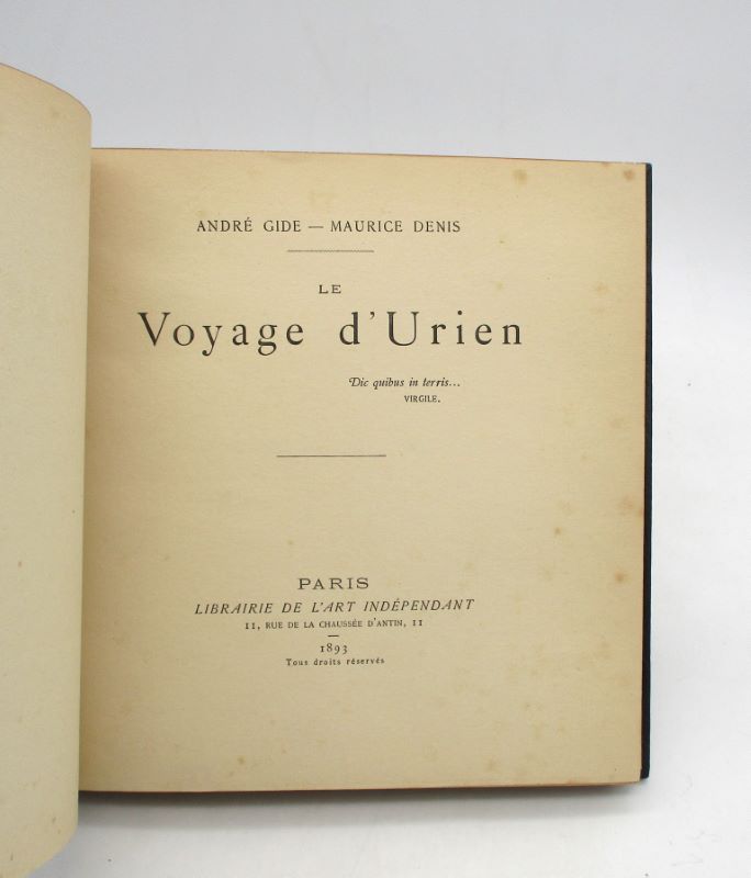 Édition originale illustrée de 30 lithographies de Maurice Denis, en noir et ocre pour la première partie, en noir et vert pour la seconde. Un des 300 exemplaires numérotés, seul tirage annoncé, celui-ci comporte un envoi autographe signé par l’auteur et l’artiste au peintre Jacques-Émile Blanche. Il s’agit du premier ouvrage illustré publié par Maurice Denis qu’il le fit à la demande de Gide. L’auteur et l’artiste était tous deux des proches de Jacques-Émile Blanche, le premier le rencontre en 1886 et le second en 1892. Ils entretinrent chacun une abondante correspondance avec le portraitiste et Denis participa à plusieurs expositions collective avec Blanche. Carteret, IV, 184; Yves Peyré, Peinture et poésie. Le Dialogue par le livre, 2001, p. 106 : » Ce livre est la trace la plus accentuée du symbolisme, la ratification par les Nabis du principe du livre de dialogue ».