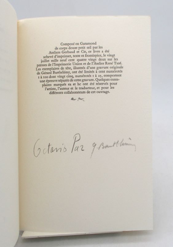 Édition originale de la traduction française de Jean-Claude Masson ornée d’un frontispice de Gérard Barthélémy. Un des quelques exemplaires de collaborateur, signé à la justification par l’artiste et l’auteur, celui-ci tiré sur Ingres d’Arches comporte un envoi autographe signé de l’auteur à Angelo Rinaldi, journaliste et critique littéraire connu pour son acerbité.
