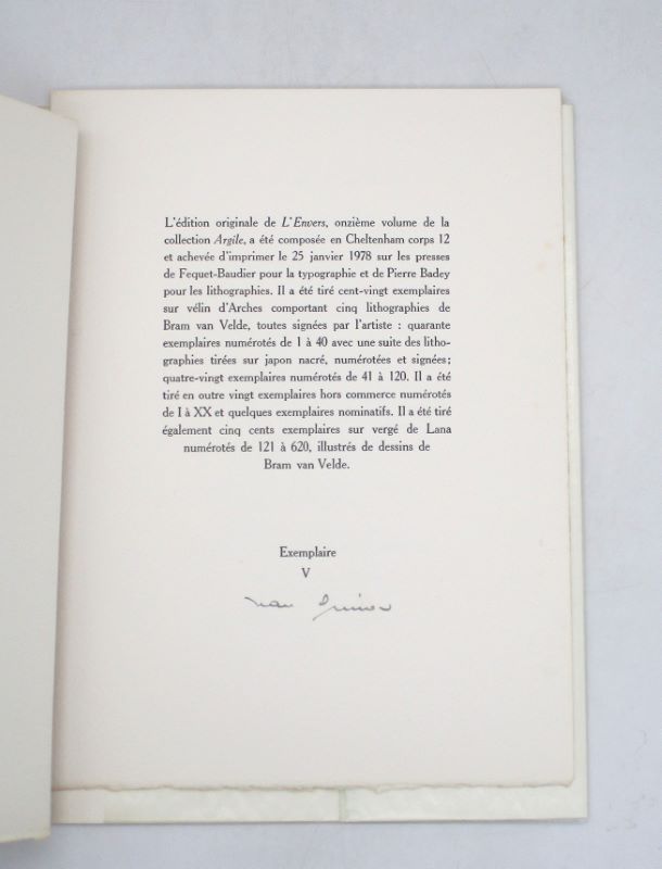 Édition originale illustrée de 5 lithographies en couleurs signées par l’artiste. Un des 20 exemplaires hors commerce tirés sur vélin d’Arches, signé à la justification par l’auteur et l’artiste et comportant une suite des gravures signées tirées sur Japon nacré.