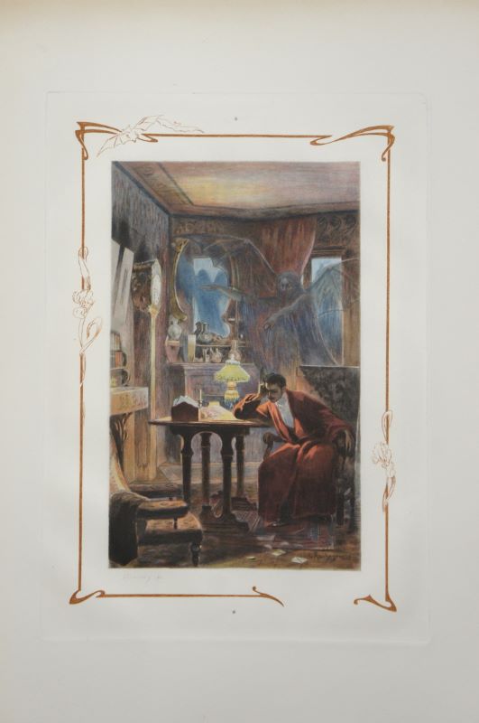 Un des 150 exemplaires (n°108) sur vélin (après un exemplaire unique), contenant une DOUBLE SUITE (limitée à 50 exemplaires) des gravures à l’eau-forte en premier état et des eaux-fortes avec la remarque, ainsi qu’une SUITE des fumés sur papier de Chine des gravures sur bois des ornementations. Exemplaire de l’imprimeur Philippe Renouard.