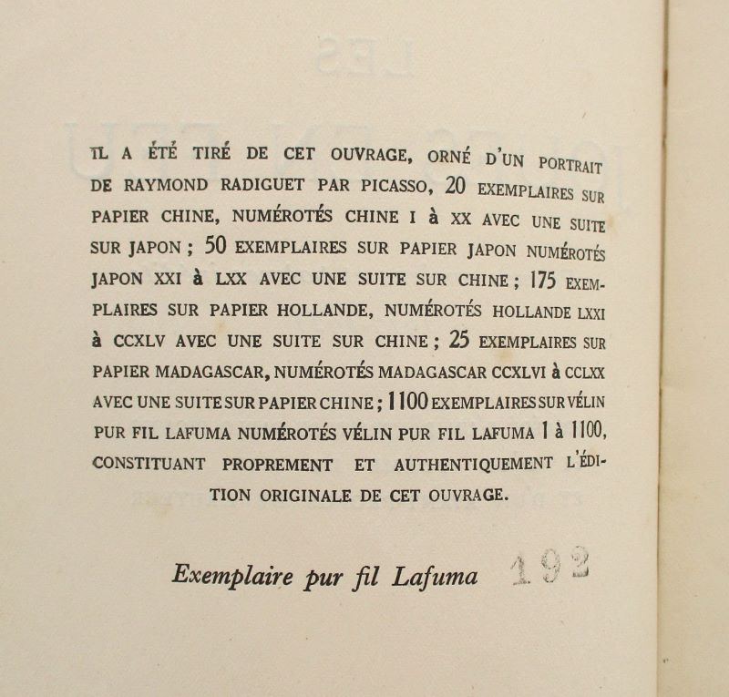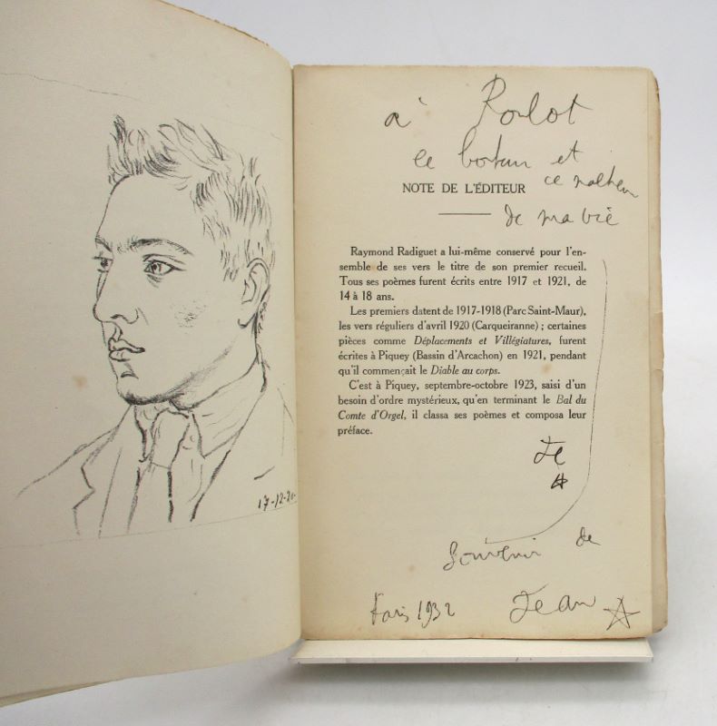 Édition en partie originale illustrée d’un portrait de l’auteur par Picasso reproduit au frontispice et comprenant un poème de Max Jacob. Un des 1100 exemplaire sur vélin pur fil Lafuma. Celui-ci est enrichi d’un émouvant envoi autographe signé de Jean Cocteau en marge de la note de l’éditeur concernant Radiguet : « […] le bonheur et la malheur de ma vie », daté de 1932. Cocteau évoque ici la passion qu’il entretint pour le jeune Raymond Radiguet et le désespoir qu’il ressentit à son soudain décès.
