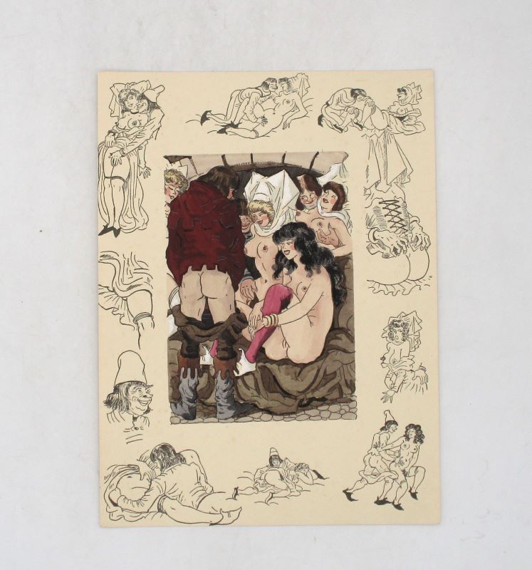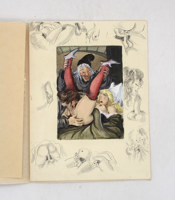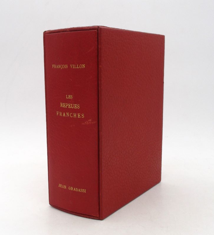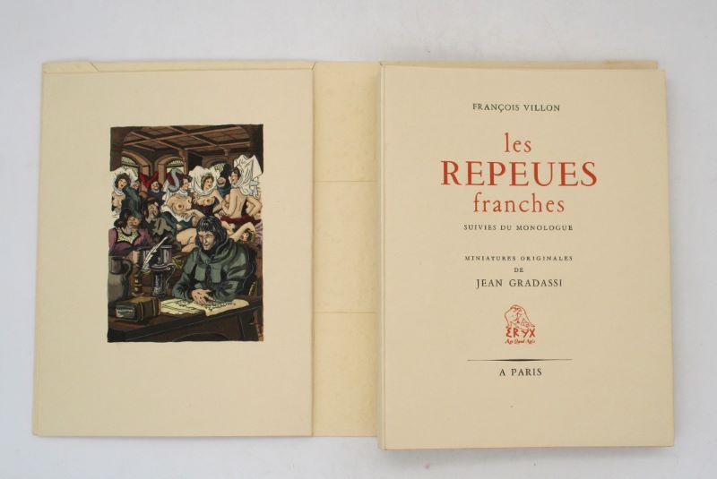 Édition illustrée des compositions rehaussées en couleurs de Jean Gradassi. Un des 8 exemplaires hors commerce sur Japon cotés A à H comprenant un dessin rehaussé en couleurs, un croquis libre à la mine de plomb, trois suites (un état en noir, un en rouge et un en bleu), un cuivre, deux suites des planches hors commerce avec remarques (un état en noir et un rehaussé de couleurs) les bons à tirer d’une planche, trait et couleurs ainsi qu’un échantillon typographique de plusieurs pages.