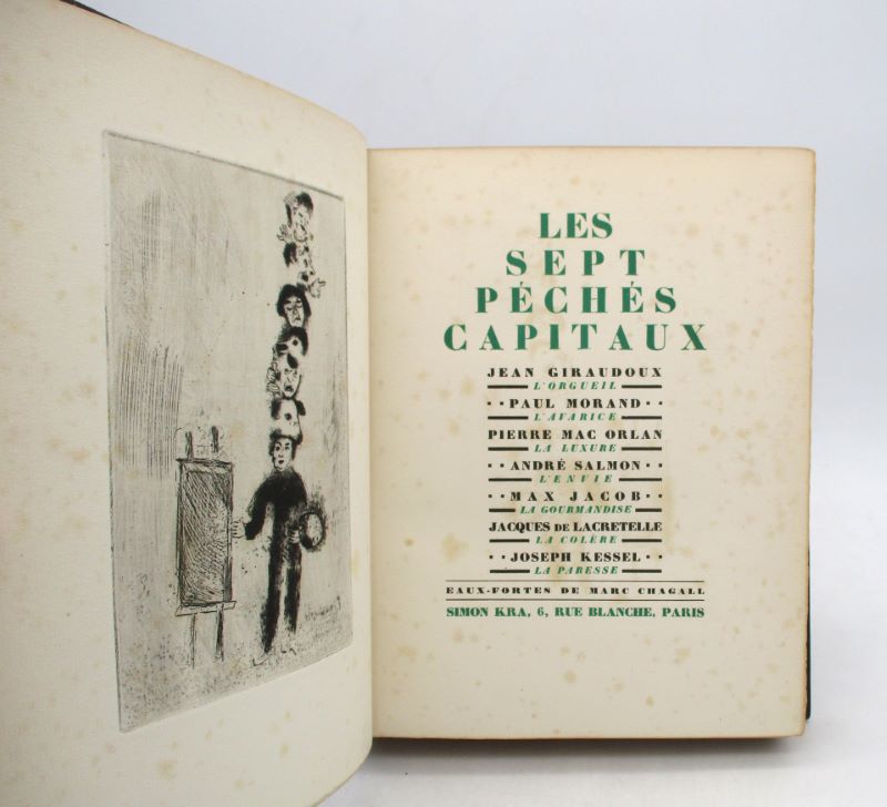Édition illustrée de 15 eaux-fortes en noir de Marc Chagall. Un des 44 exemplaires sur Hollande avec une suite des gravures en bistre et une gravure supplémentaire (annoncée à la justification), troisième papier après un exemplaire unique sur Japon à trois suites et 15 Japon à deux suites. Elle comprend les textes de Jean Giraudoux, « LOrgueil », de Paul Morand, « L’Avarice », de Pierre Mac Orlan, « La Luxure », d’André Salmon, « LEnvie », de Max Jacob, « La Gourmandise », de Jacques de Lacretelle « La Colère » et de Joseph Kessel, « La Paresse ».