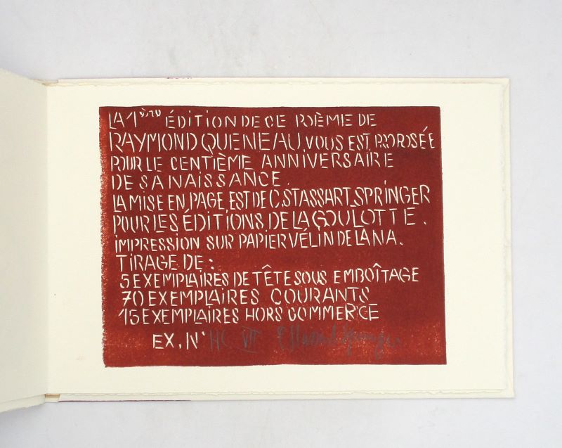 Édition originale posthume mise en page par Stassart Springer, sortie à l’occasion du centenaire de sa naissance. Un des 15 exemplaires hors commerce sur papier vélin de Lana, signé à la justification par Stassart Springer. Bel exemplaire.