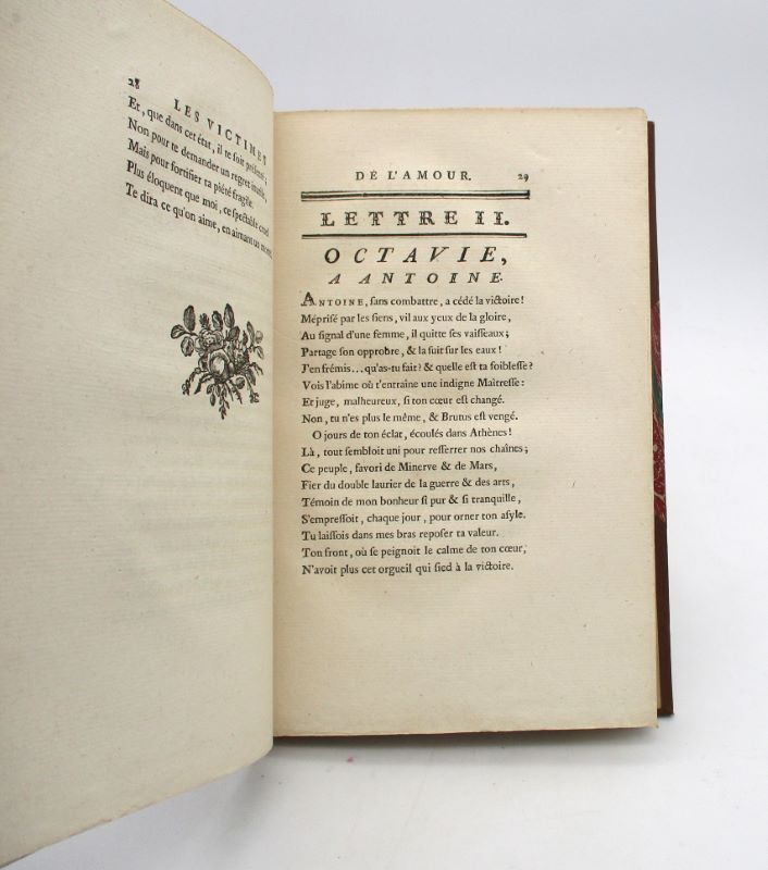 Édition originale de ce recueil de poèmes en forme de lettres. Elle est illustrée d’un titre-frontispice gravé par Lebeau d’après Marillier ainsi qu’une planche d’après le même gravée par De Ghendt.